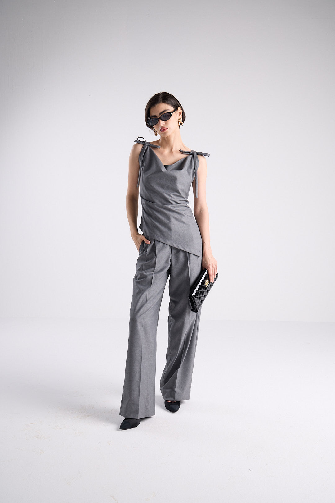Introducing the "Monsieur" set, featuring structured gray pants and a contrasting draped top. This elegant set is highlighted by delicate bows on the shoulders, adding a touch of charm. Perfect for both formal events and everyday wear, this set is the epitome of refined elegance.